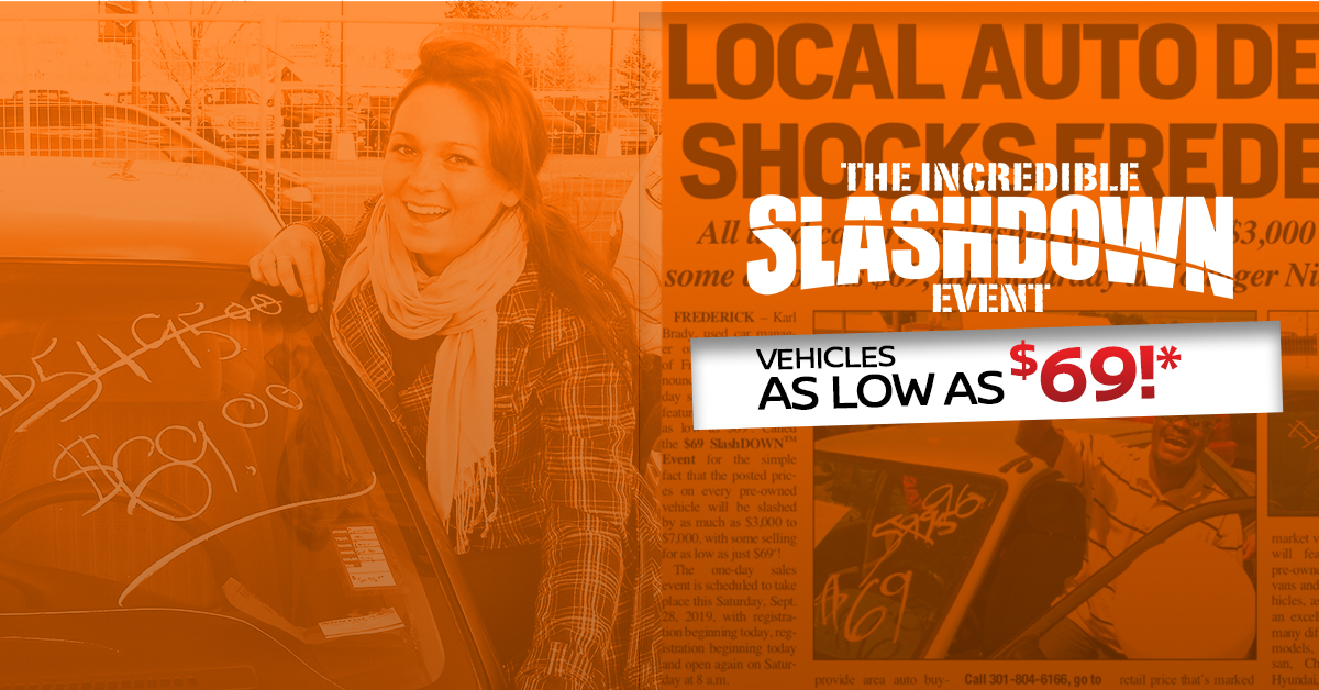 For one day only, this Saturday, September 28th, you can score unbeatable savings when you shop with us! Shop our SlashDown Sales Event, and watch us slash used vehicle prices anywhere from $3,000 – $7,000* off or you could even score your pre-owned ride for only $69*! That’s it, you can walk off our lot with a vehicle for only $69*!Â