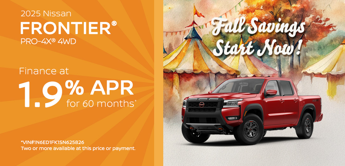 *Example: 2025 Nissan Frontier SV 4WD $41,080 MSRP. Model Code 32215. VIN 1N6ED1EK5SN635163. Stock#250322. 6 cylinder engine, 9-Speed Automatic with Overdrive transmission, 4D Crew Cab. *APR finance offer 1.9% for 60 months with approved credit through NMAC with tier 1 approval (720+ beacon score). $17.48 per month, per $1,000 financed. Not all will qualify. Must take delivery from retail stock. Prior sales excluded. Offer subject to change. Offer expires on 09/02/2025.
