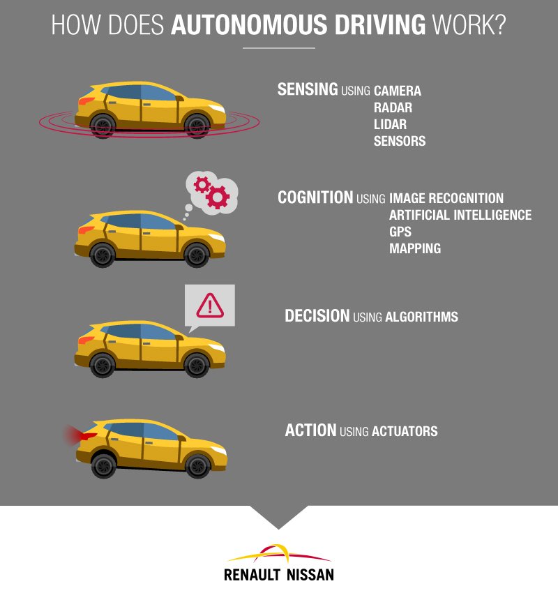 How does autonomous driving work? It’s both simple and complicated, kind of like how we drive. The car senses its surrounding situation and makes an inference. It then decides what to do using an algorithm and computer and then performs an action based on the algorithm.