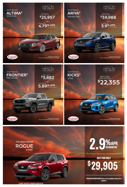 Are you in search of a vehicle as unique and timeless as your individual style? Perhaps the contemporary models from manufacturers fail to capture your interest. At Younger Nissan, we understand that not all rides are created equal, and sometimes, you’re simply seeking a reliable vehicle at an affordable price. Our dealership takes pride in offering dependable options to our customers, regardless of their preferences in terms of year, make, model, or budget. Explore the enticing Pre-Owned Specials below and embark on a drive off into the sunset today! Remember to reach out to us to schedule a test drive, allowing you to truly experience the essence of your chosen ride!