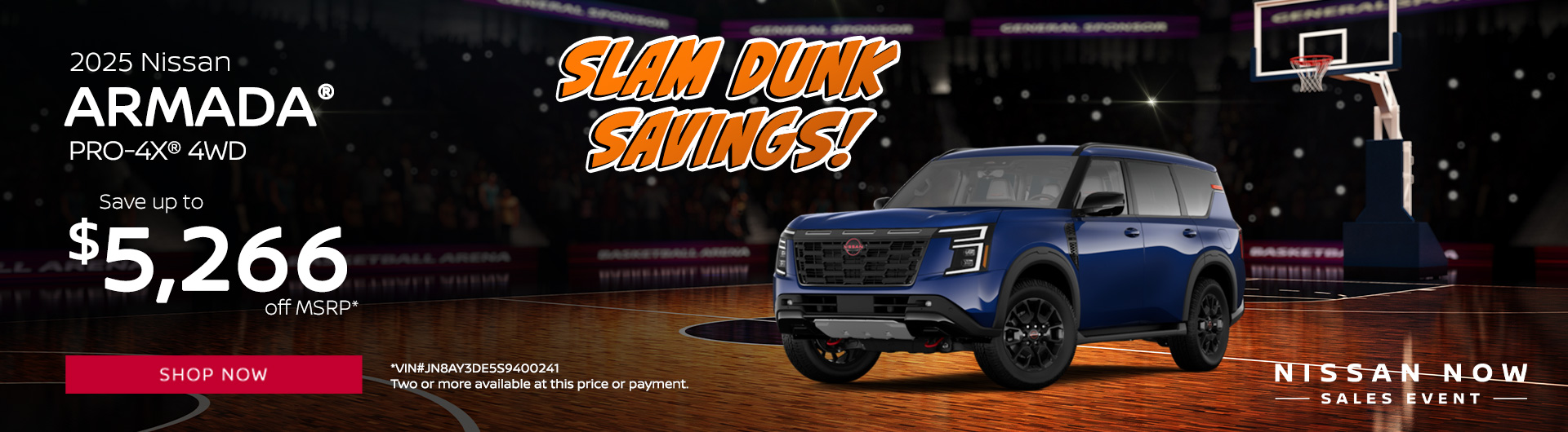 *2025 Nissan Armada PRO4-X 4WD $77,235 MSRP. Model Code 26615. VIN JN8AY3DE5S9400241. Stock#250215. 6 cylinder engine, 9-Speed Automatic transmission, 4D Sport Utility. Not all will qualify. Must take delivery from retail stock. Prior sales excluded. Offer subject to change. Dealership prices exclude taxes, title, license, freight and dealer processing fee of $799.00. We provide Savings on our vehicles daily based on current inventory supply. Price quoted is subject to market area. Check to see if this vehicle qualifies for a further reduced Sale Price. Offer expires on 03/31/2025.