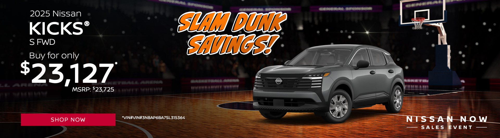 *2025 Nissan Kicks S FWD $23,725 MSRP. Model Code 21115. VIN 3N8AP6BA7SL315364. Stock#250070. 4 cylinder engine, CVT with Xtronic transmission, 4D Sport Utility. Not all will qualify. Must take delivery from retail stock. Prior sales excluded. Offer subject to change. Dealership prices exclude taxes, title, license, freight and dealer processing fee of $799.00. We provide Savings on our vehicles daily based on current inventory supply. Price quoted is subject to market area. Check to see if this vehicle qualifies for a further reduced Sale Price. Offer expires on 03/31/2025.